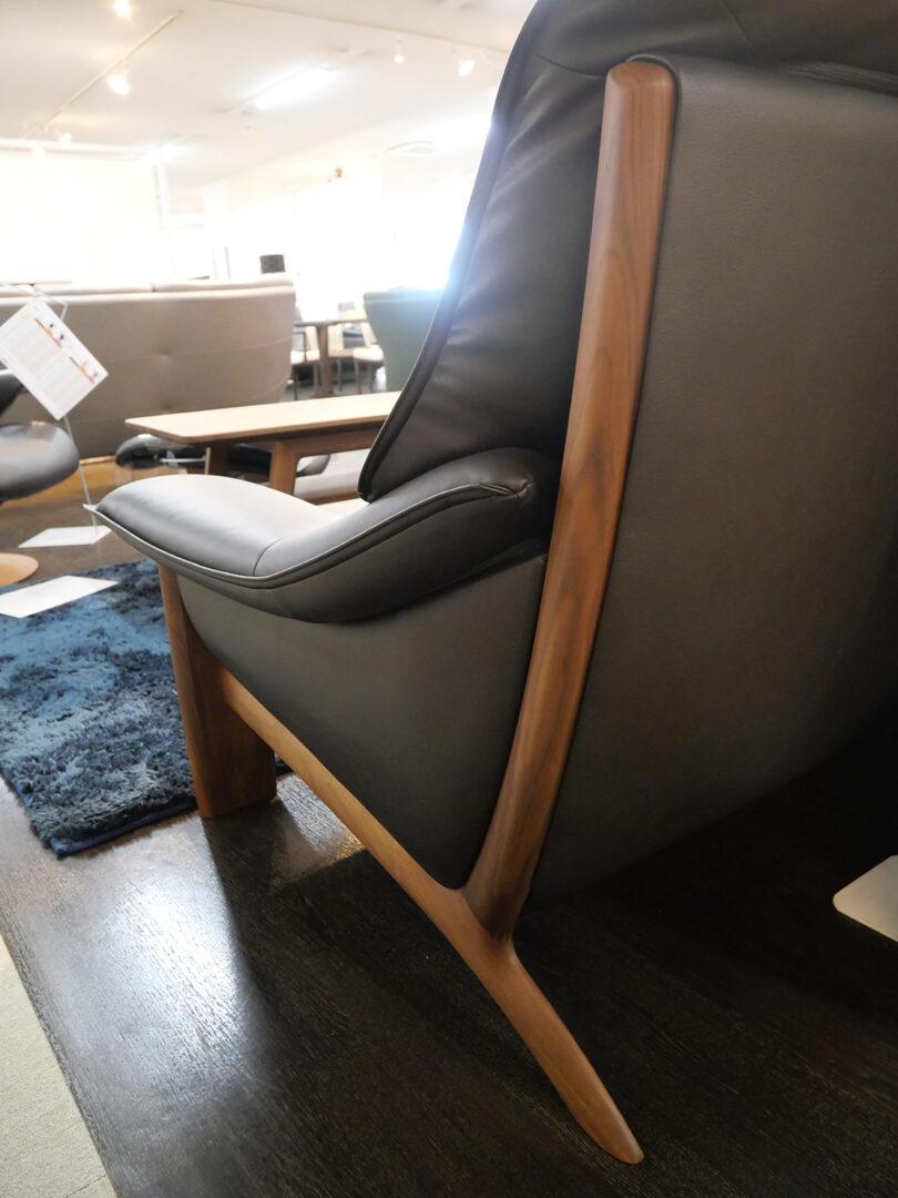 アクセントにあしらった木部脚がかっこいい。展示はウォールナットです。