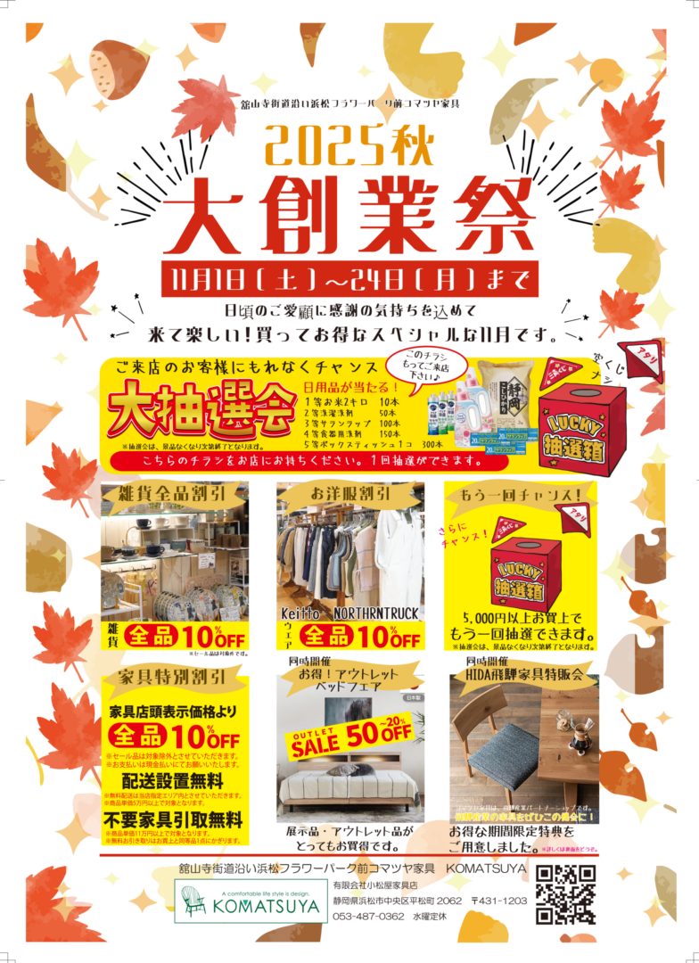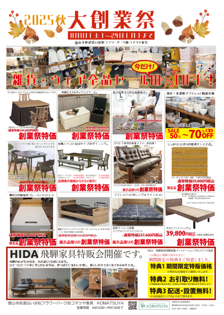 2025.10.31 11月1日土曜日からとってもお得な創業祭開催です。 お知らせ この記事のタイトルとURLをコピーする 舘山寺街道沿い浜松フラワーパーク前コマツヤ家具 電話053-487-0362 飛騨の家具販会開催中!~11月24(月)まで 前の記事 メーカー協賛!お得なダイニングセットが入荷しました。 次の記事