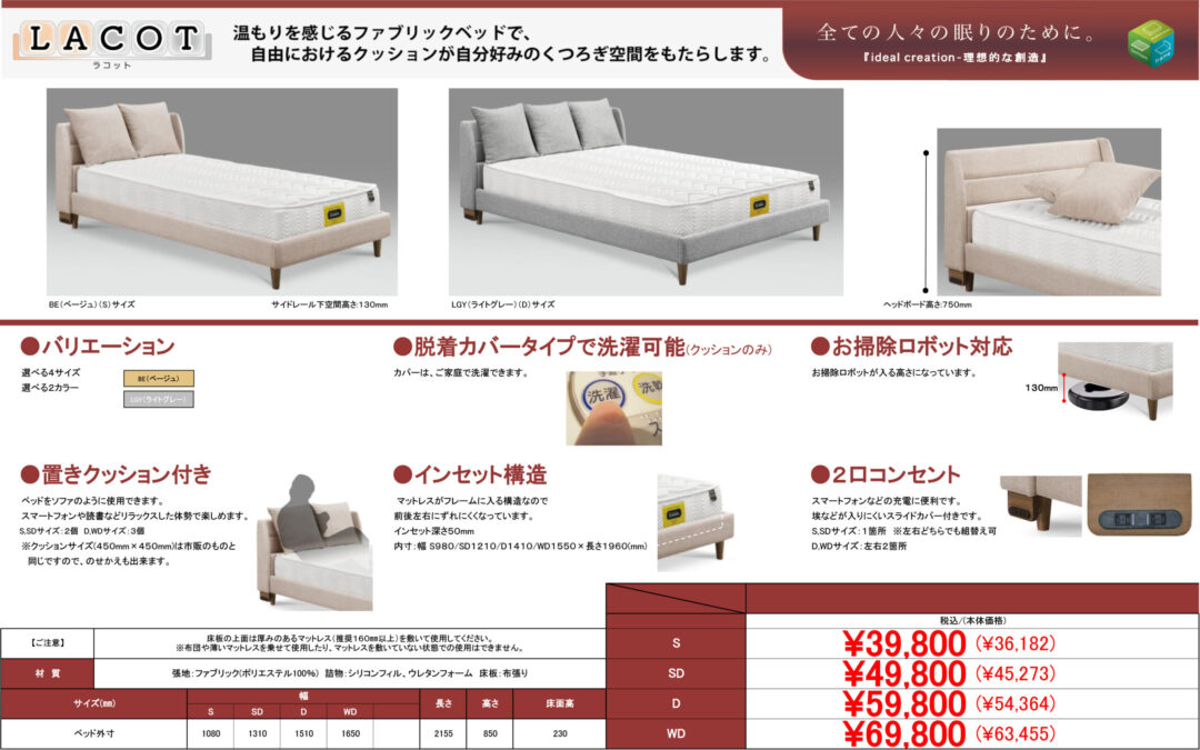 シングルサイズでフレーム価格39,800円税込(配送・組立設置料金別)