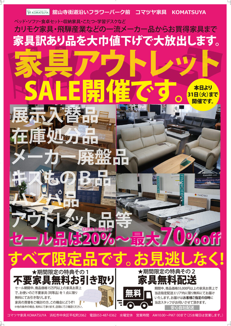 舘山寺街道沿い浜松フラワーパーク前コマツヤ家具 電話053-487-0362 水曜定休